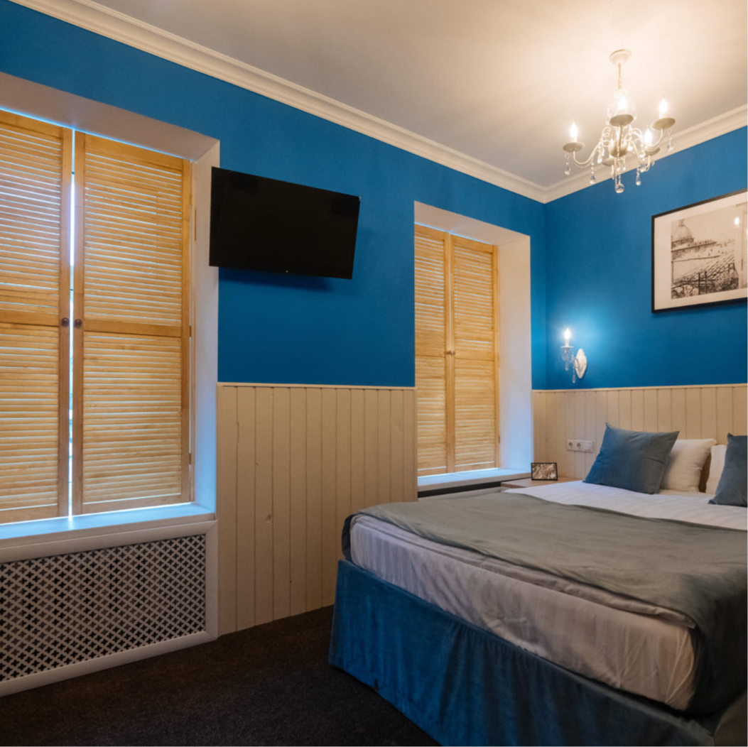 Уютный средний номер в итальянском стиле с двуспальной кроватью, оборудованный удобным санузлом, телевизором и Wi Fi.